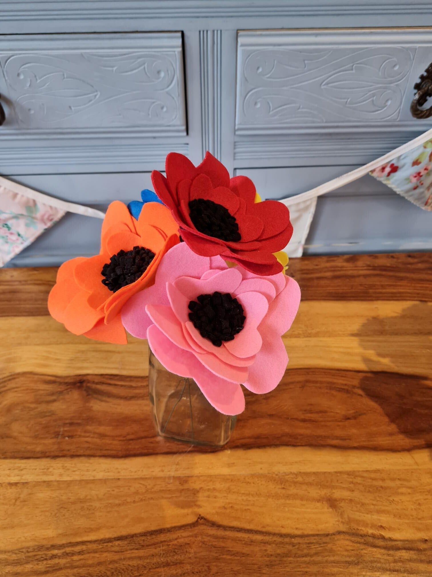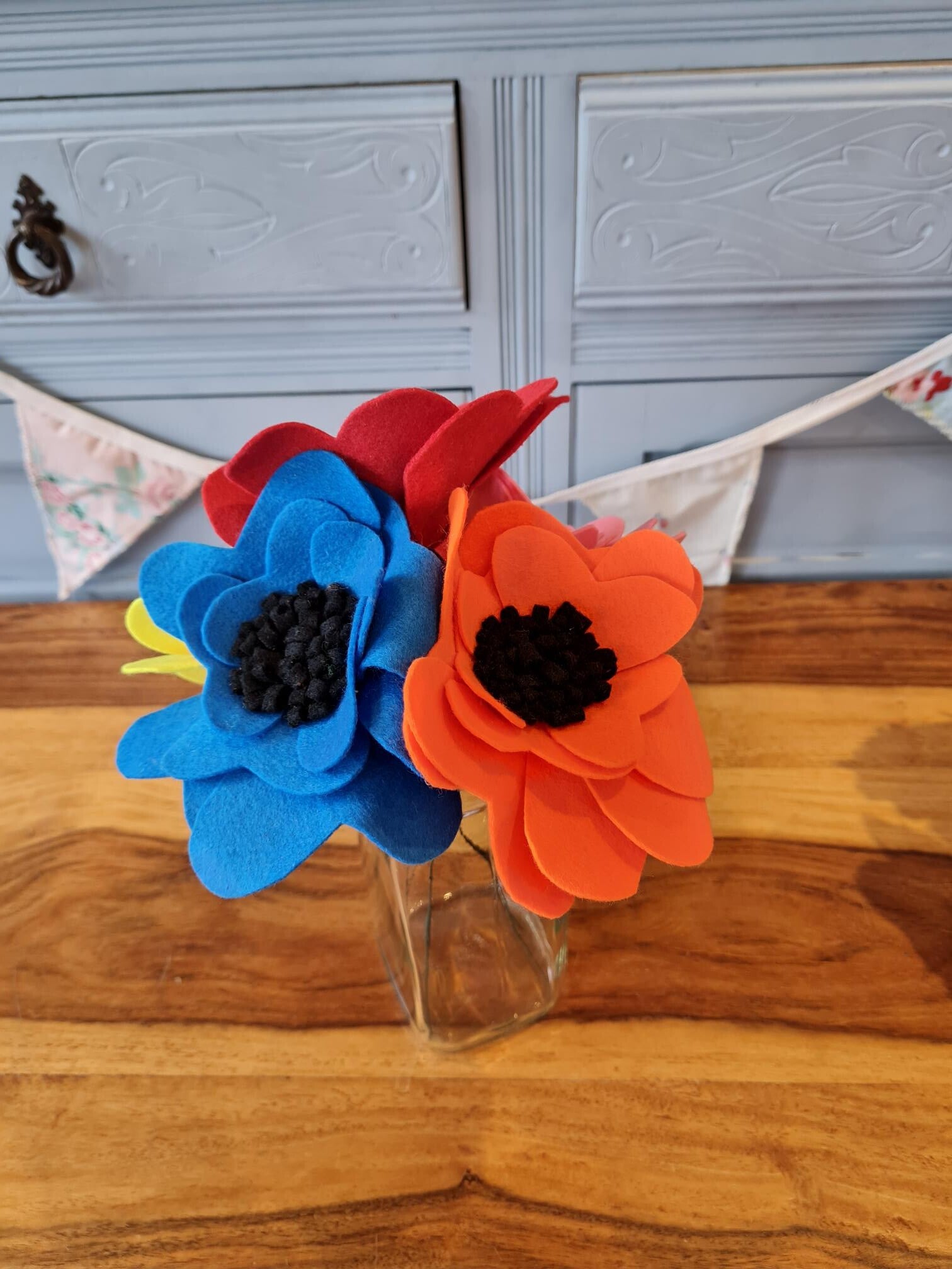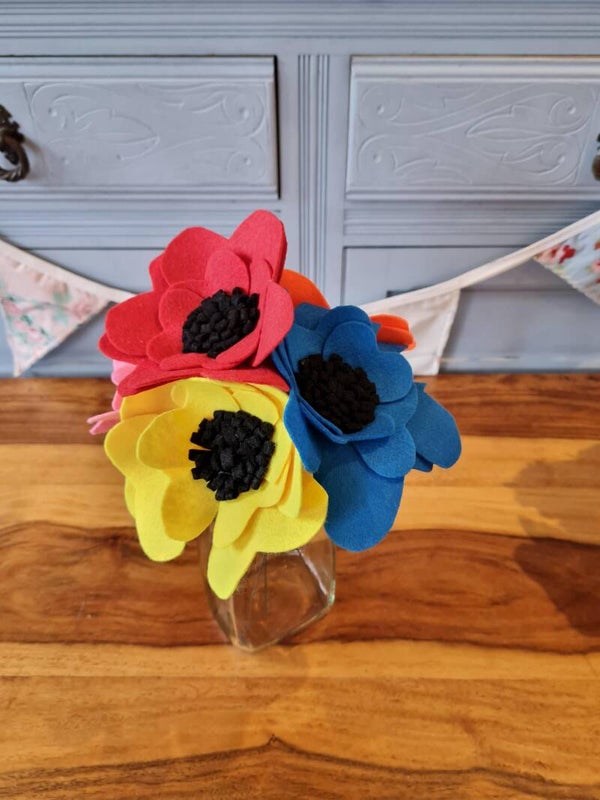 These beautiful felt flowers are handmade to order. The colours can be customised so please contact us to discuss your requirements. Each flower is assembled on a flexible stem so you can arrange them to suit your vase. Please note, vase not included.