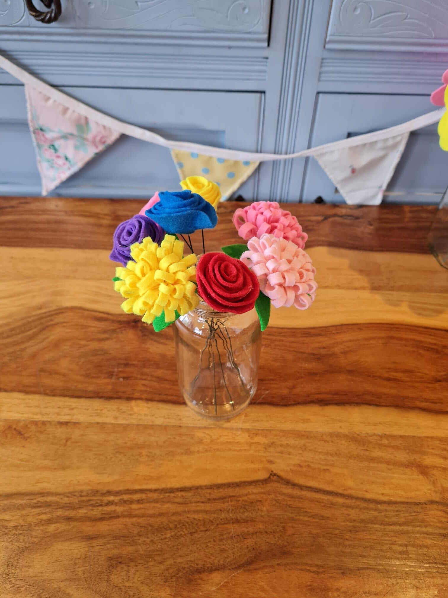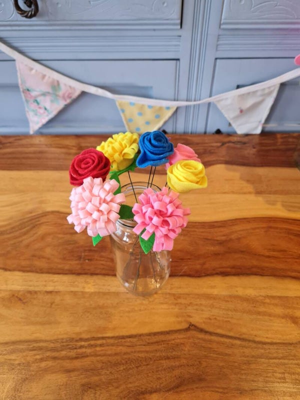 These beautiful felt flowers are handmade to order. The colours can be customised so please contact us to discuss your requirements. Each flower is assembled on a flexible stem so you can arrange them to suit your vase. Please note, vase not included.
