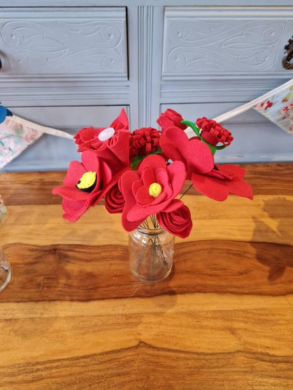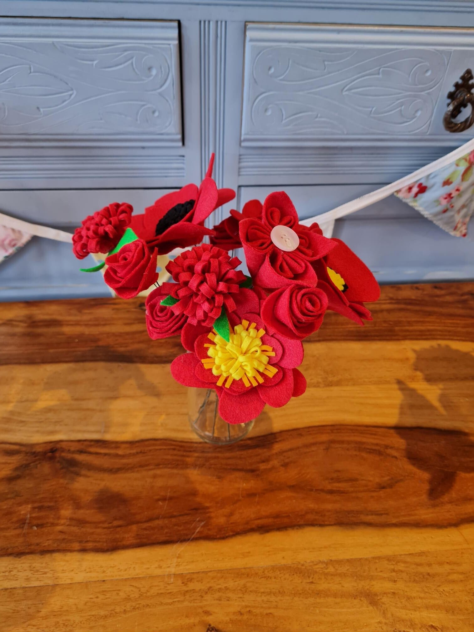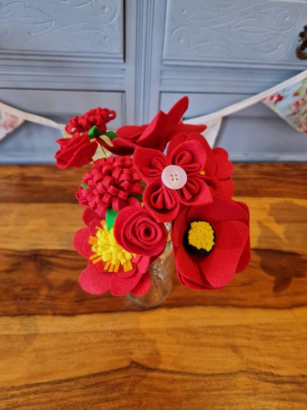 These beautiful felt flowers are handmade to order. The colours can be customised so please contact us to discuss your requirements. Each flower is assembled on a flexible stem so you can arrange them to suit your vase. Please note, vase not included.