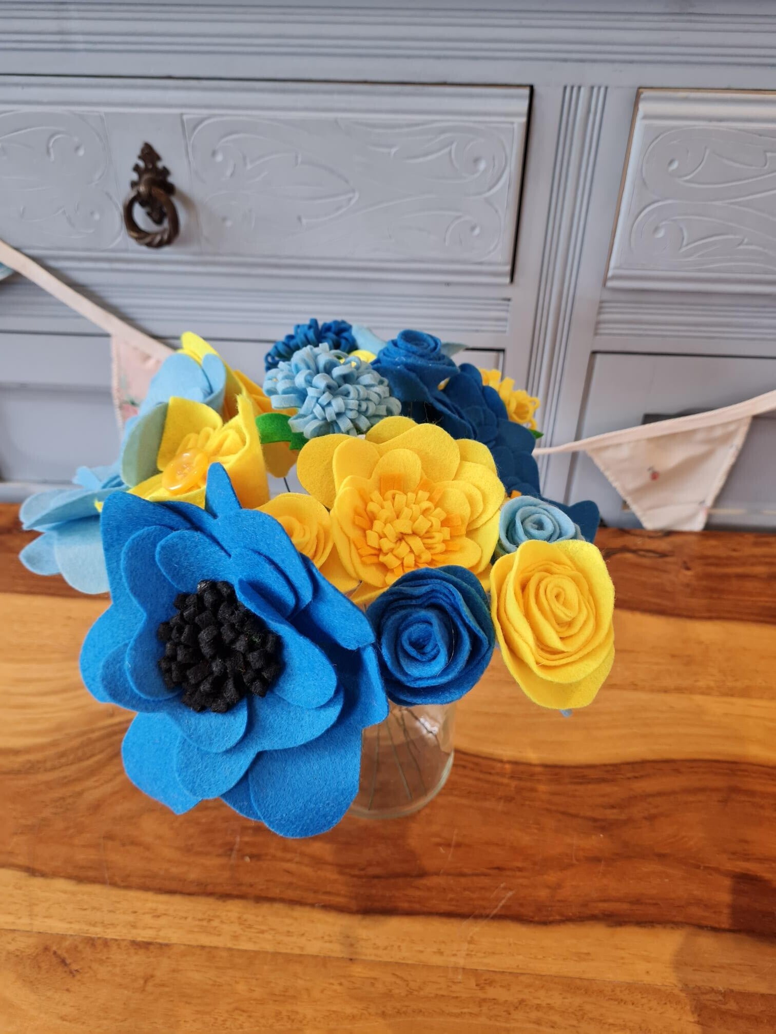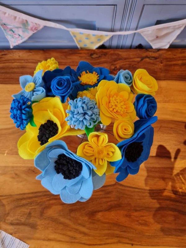 These beautiful felt flowers are handmade to order, inspired by our very own wedding theme. The colours can be customised so please contact us to discuss your requirements. Each flower is assembled on a flexible stem so you can arrange them to suit your vase. Please note, vase not included.