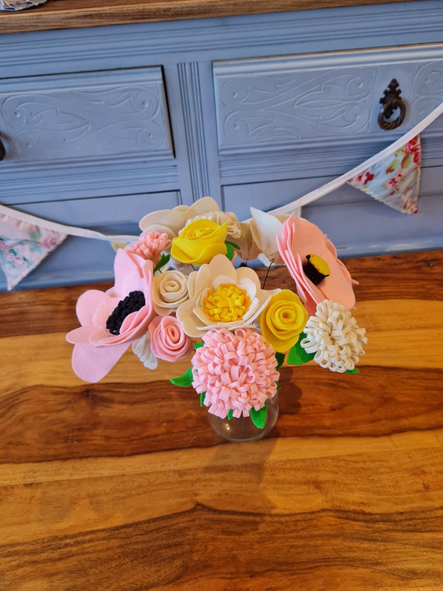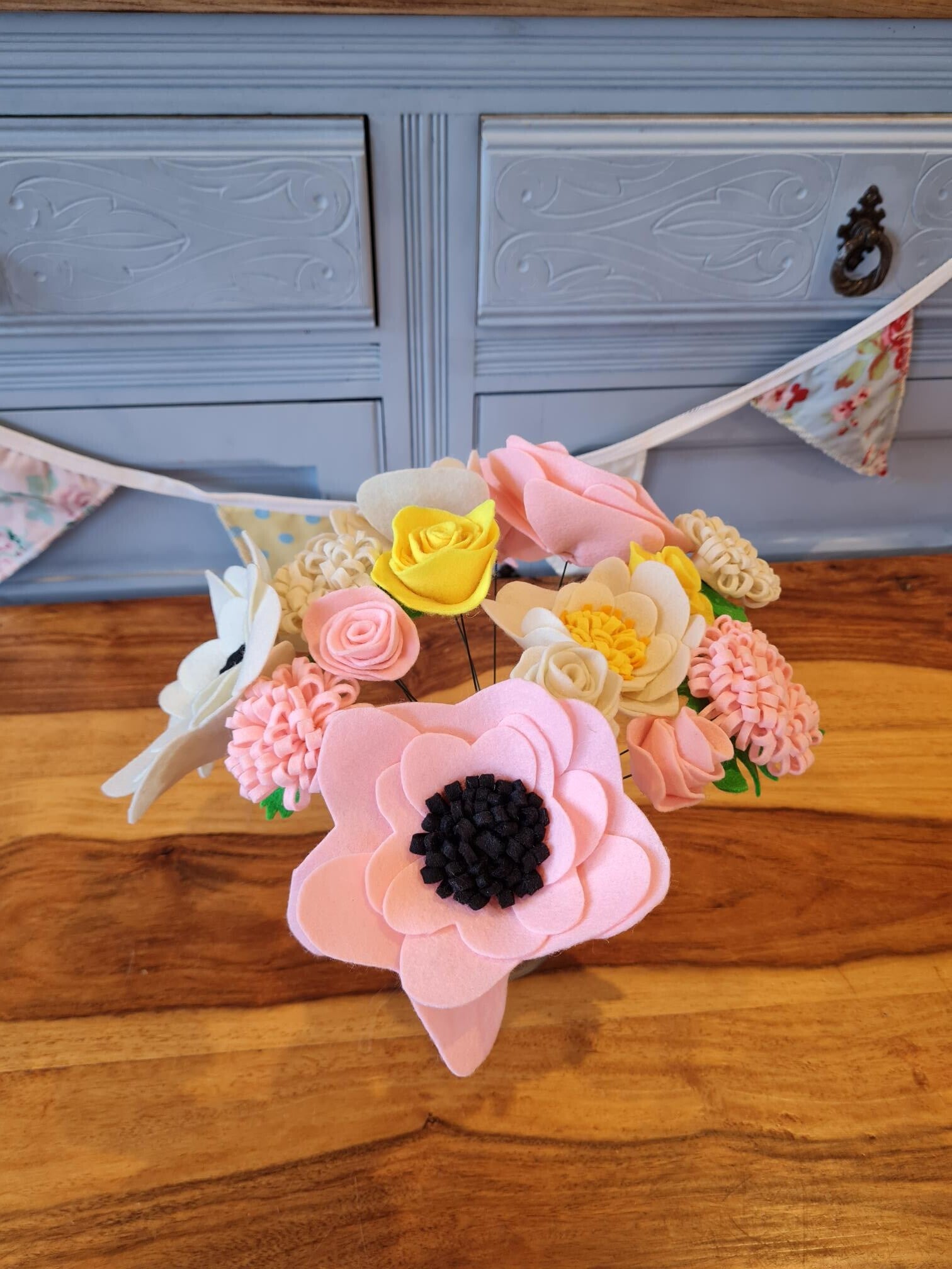 These beautiful felt flowers are handmade to order. The colours can be customised so please contact us to discuss your requirements. Each flower is assembled on a flexible stem so you can arrange them to suit your vase. Please note, vase not included.