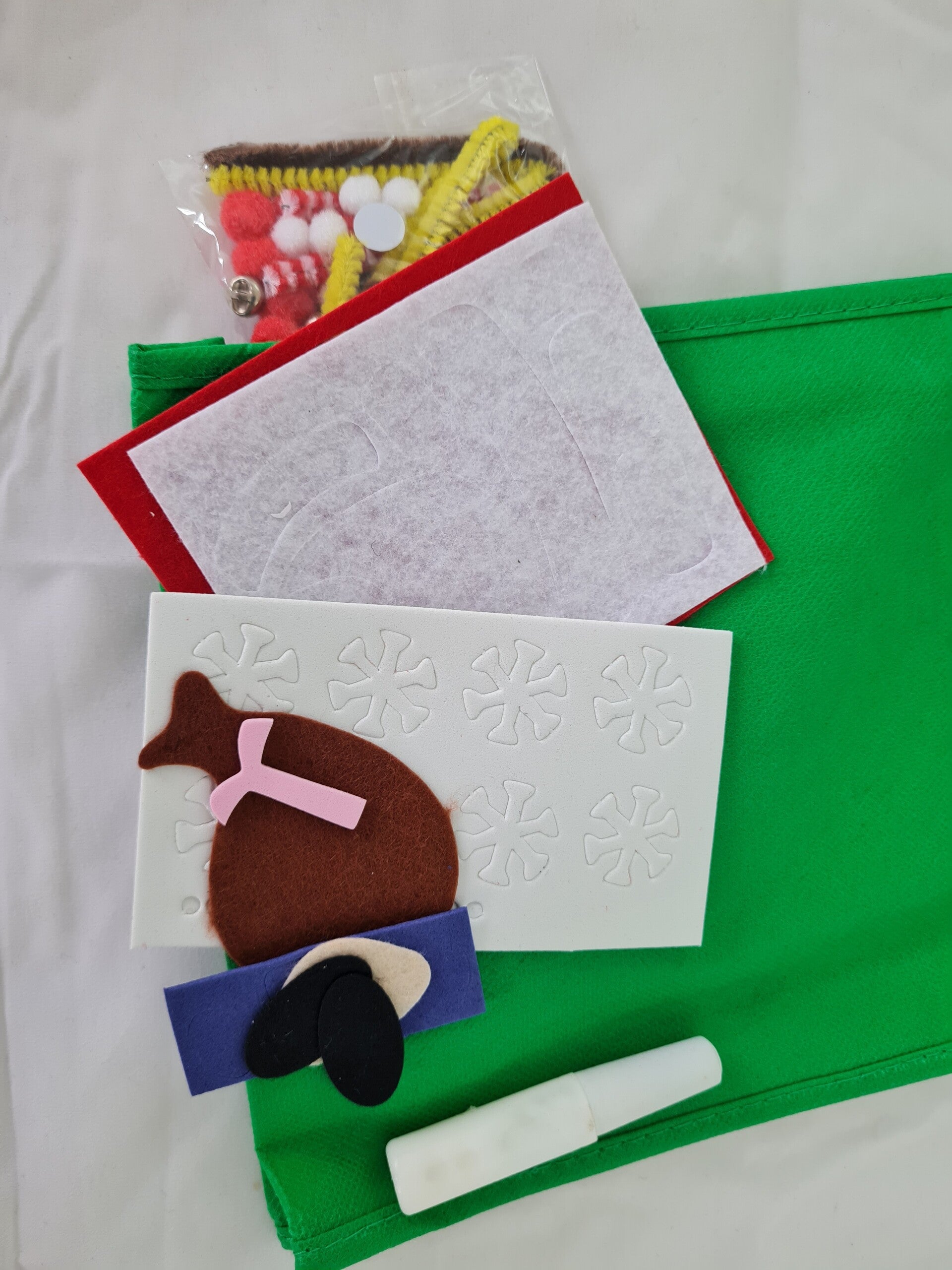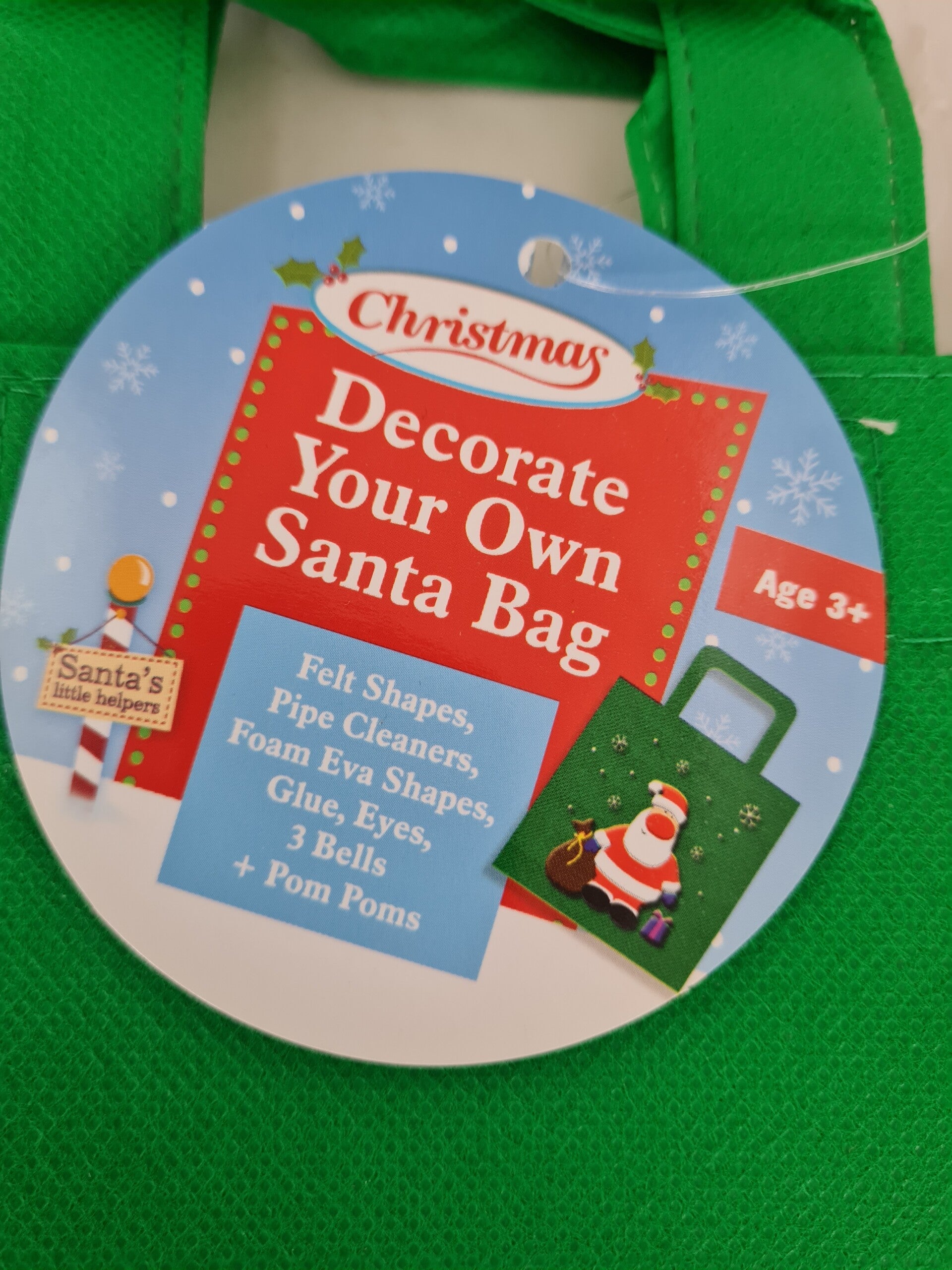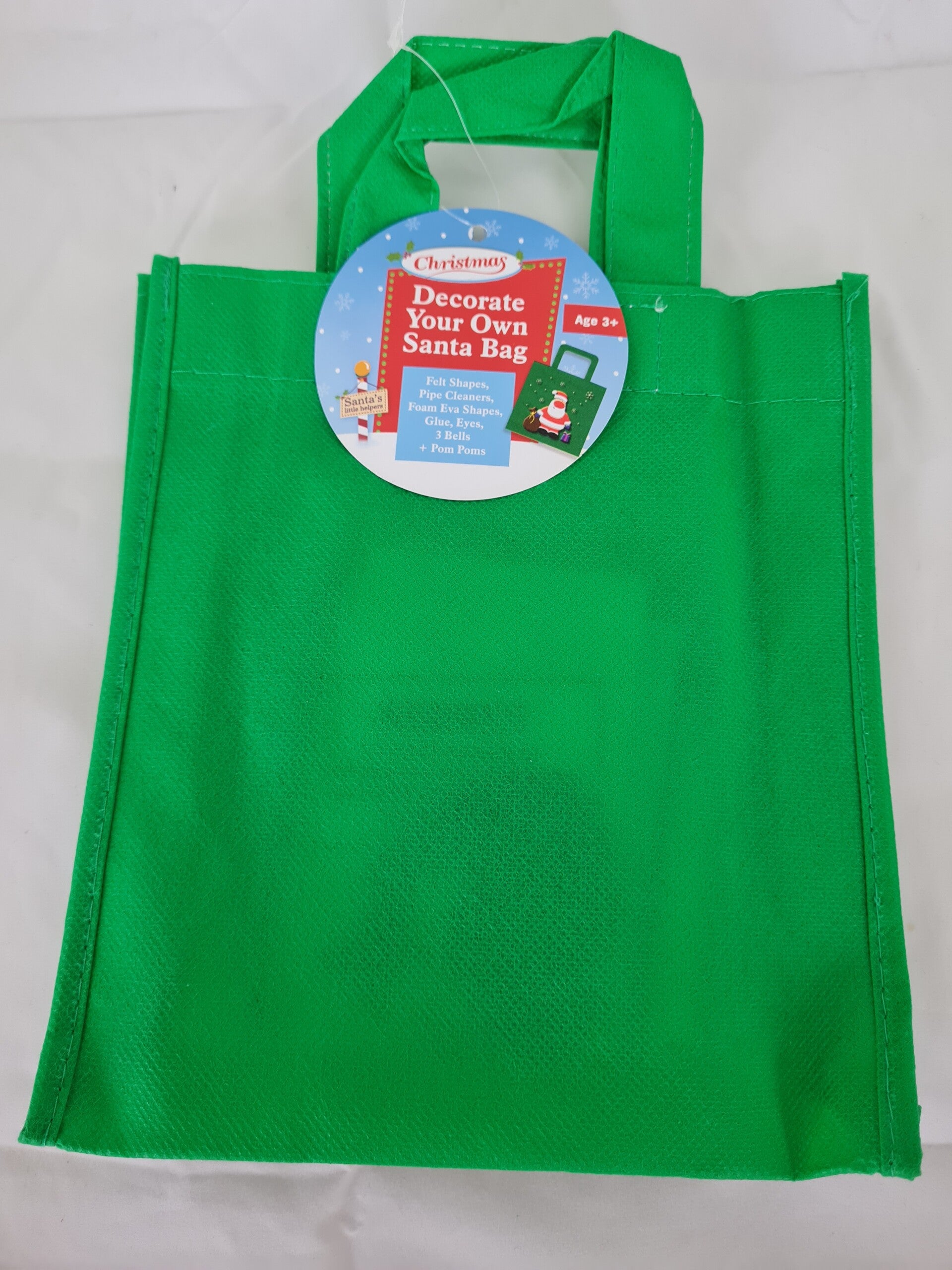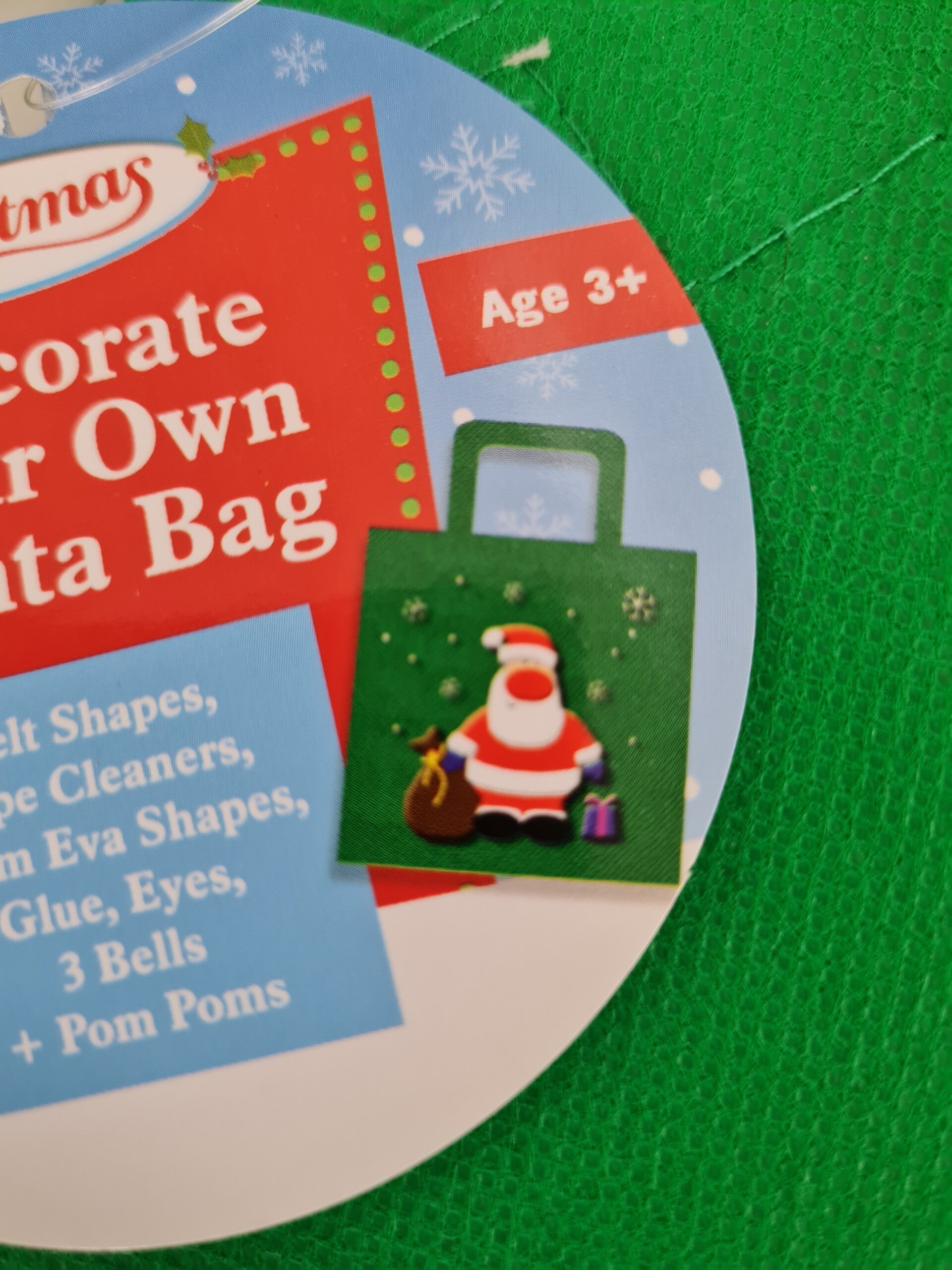 Each kit comes with everything needed to make your own Santa bag - pre-cut felt shapes, pipe cleaners, foam shapes, glue, googly eyes, pom poms and 3 jingly bells.