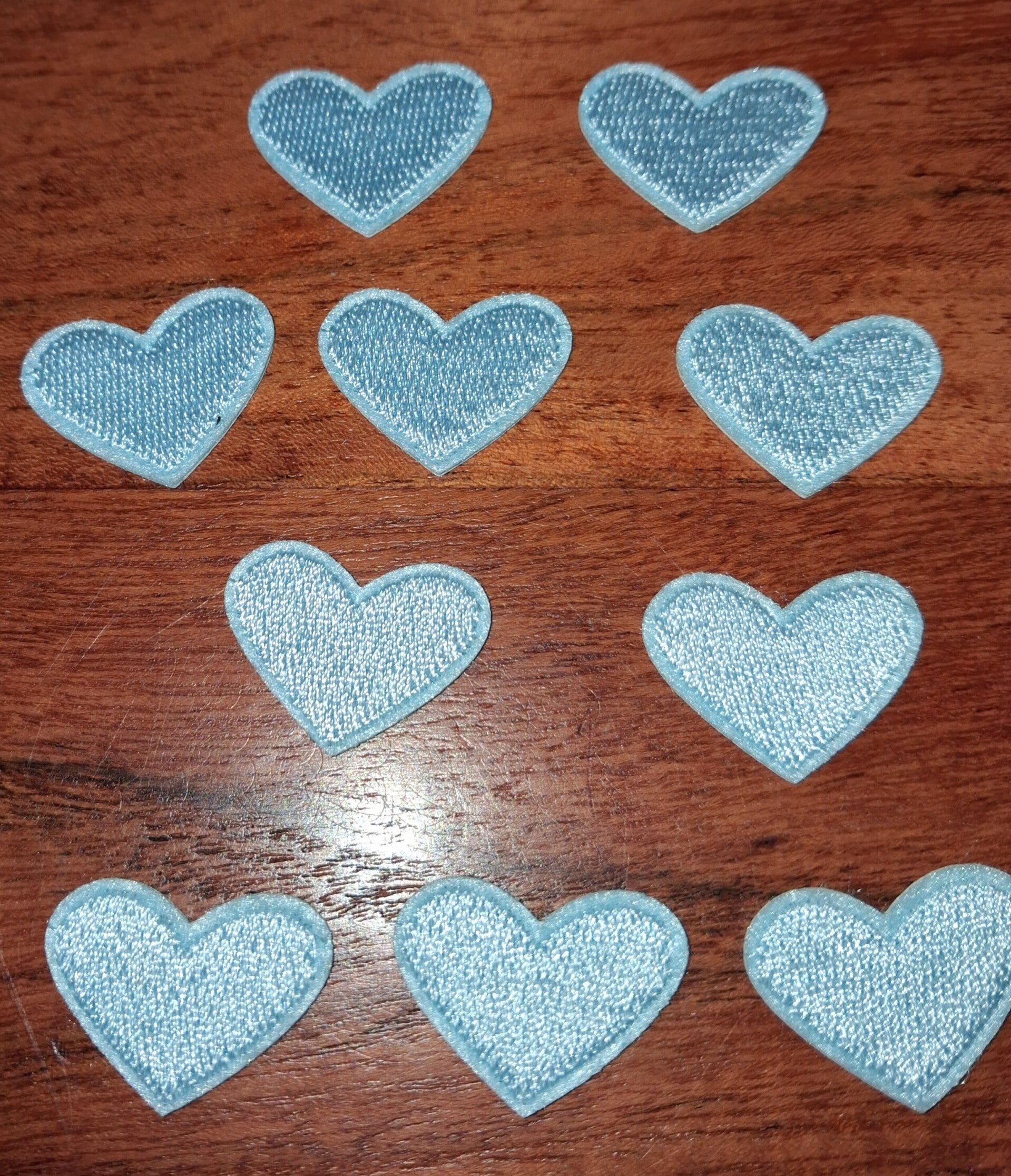 Pack of 10 iron on heart patches. These measure approximately 2.5cm x 2cm. Perfect for sewing projects.
